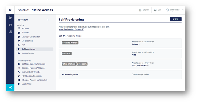 IT는 인증 자체 프로비저닝을 계속 제어해야 합니다. 그렇기 때문에 SafeNet Trusted Access에서 IT 관리자가 어떤 유형의 인증자가 어떤 사용자 그룹에 의해 자체 등록될 수 있는지 구성할 수 있는 유연성을 제공합니다.